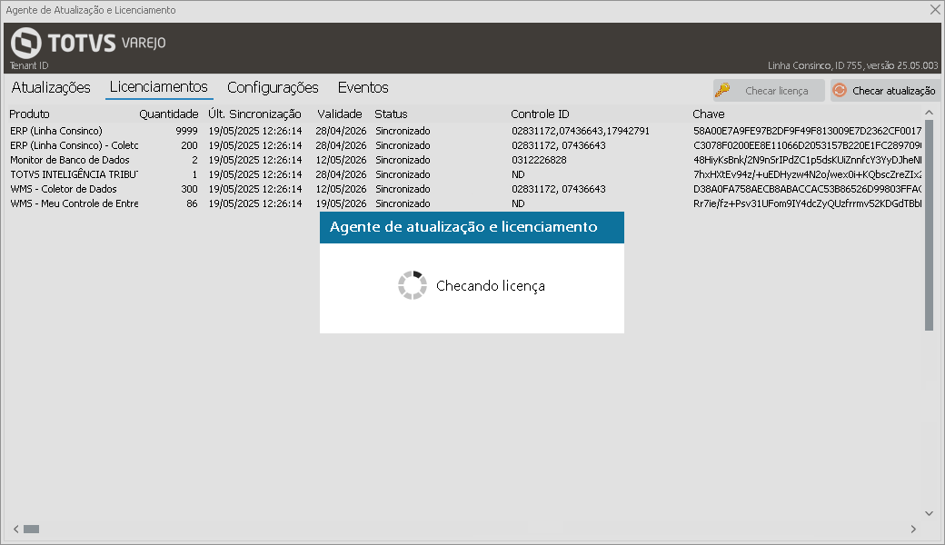 Na aba Licenciamentos, é possível visualizar as chaves de cada produto, com suas respectivas informações. O Agente verifica e atualiza automaticamente novas chaves de licenciamento.