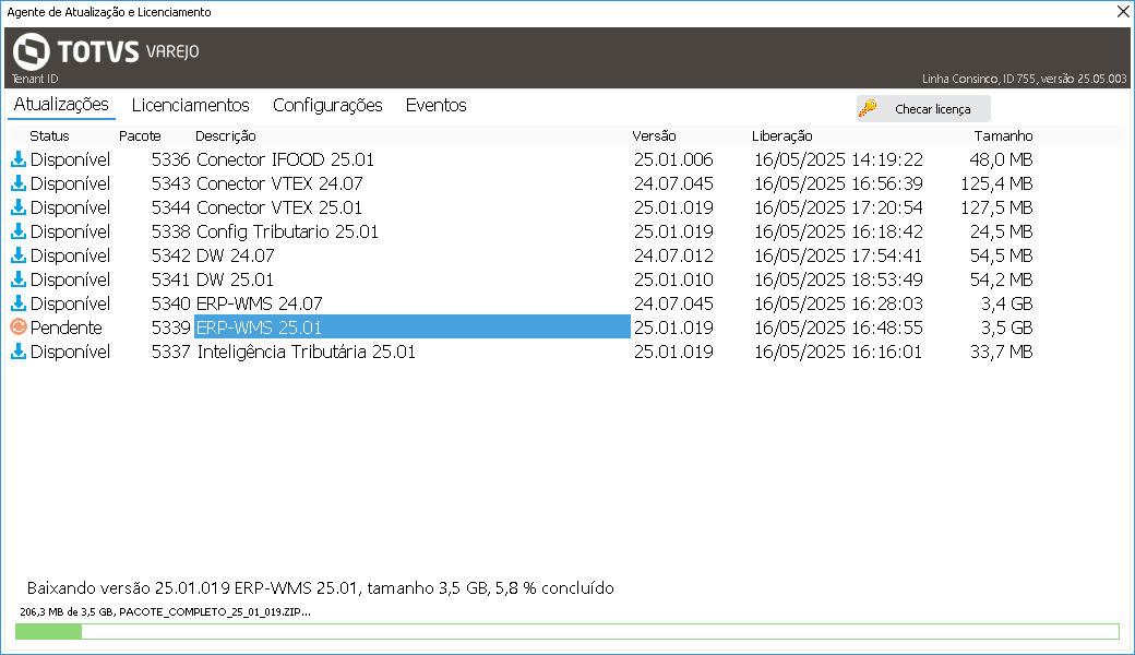 Ao concluir o download do pacote de atualização, o ícone correspondente será atualizado e o status exibido como Baixado, conforme demonstrado abaixo.