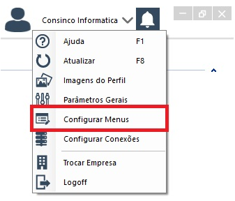 Para que as aplicações do Consinco ERP estejam disponíveis no Consinco Menu, deve-se configurá-las nos respectivos menus. Para isso, após logar no Consinco Menu, no menu do usuário, clique em ‘Configurar Menus’, conforme indicado na imagem abaixo. Lembrando que essa configuração só ficará disponível para usuários com perfil ‘Administrado’ .