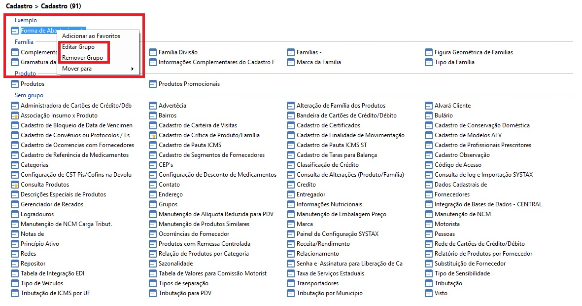 Para editar ou remover um grupo, posicione o cursor sobre algum item que esteja dentro do grupo que deseja manipular, dê um clique com o botão direito e selecione a opção desejada: ‘Editar grupo’ ou ‘Remover grupo’, conforme imagem abaixo.