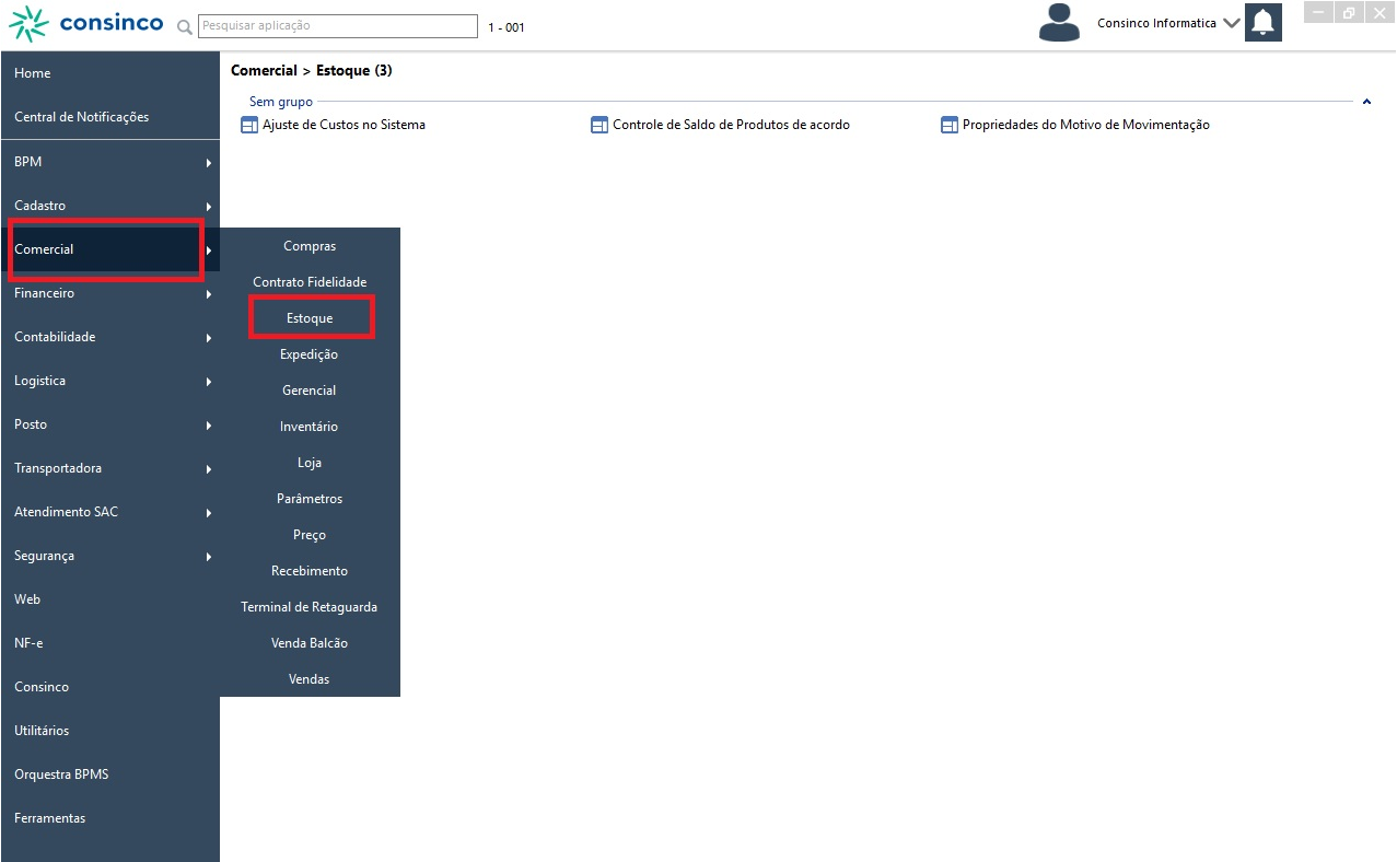 Ao acessar o Consinco Menu, é visualizado dentro do submenu ‘Estoque’ as aplicações pertencentes a este módulo. Conforme imagem abaixo.