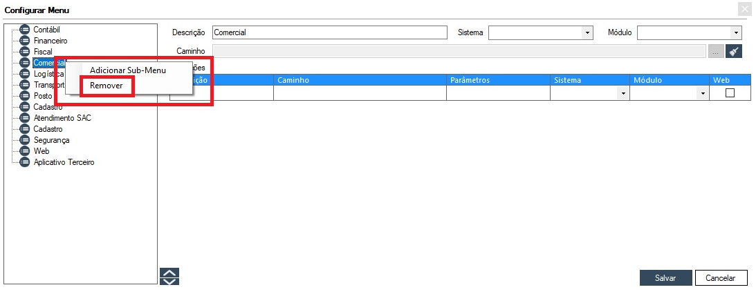 -Remover cadastros: Para remover as configurações, selecione a linha que deseja remover e clique com o botão direito, ou se deseja apenas não exibir o item no menu, desmarque a opção ‘Ativo’, conforme imagem abaixo.