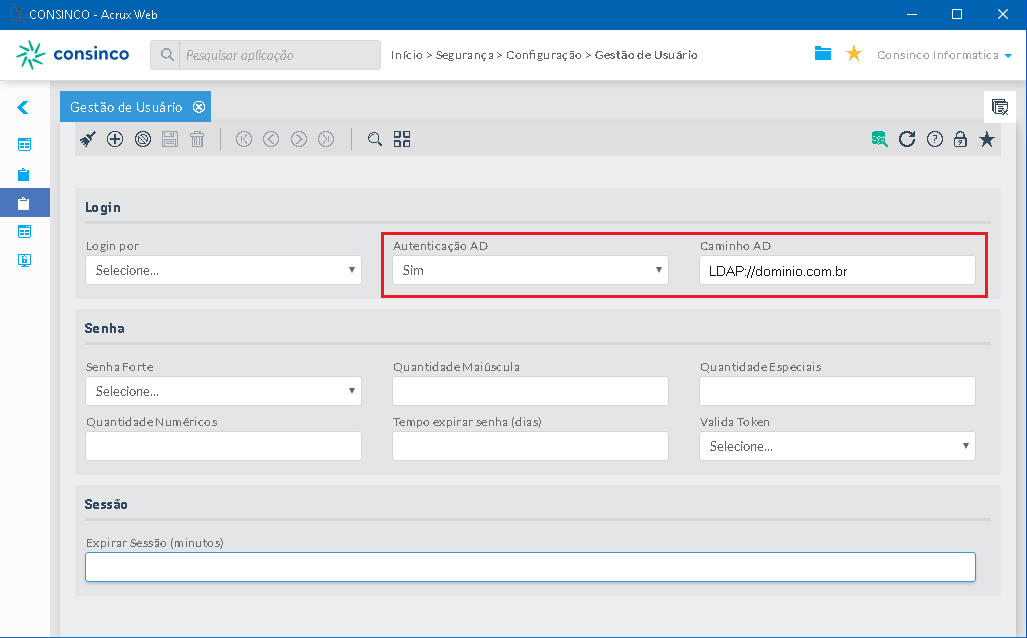 A configuração do AD hoje está disponível apenas no Segurança Web. Deve ser dividida em duas etapas: Na primeira é feita a ativação do recurso, e na segunda, deve-se parametrizar o usuário para utilizar o recurso.