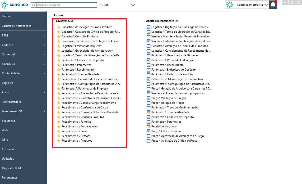 As aplicações que já foram favoritas na versão web do ERP Consinco também são exibidas no Consinco Menu.