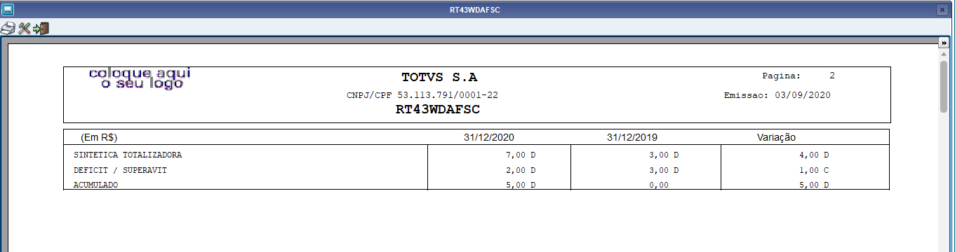 Na entidade gerencial que recebeu os saldos acumulados na 3º linha está a soma dos períodos 2020 com 2,00 e 2019 com 3,00 da linha 02 (Deficit / Superavit). |