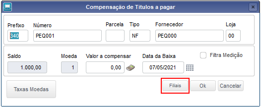 Opción Sucursales: Se utiliza para seleccionar las sucursales que se considerarán en la compensación. (Explicación detallada a continuación) Con los datos del título que se compensará, podemos seleccionar el valor que se compensará como límite para compensación, e incluso la fecha de la baja. El Flag ‘Tít. Marcados’ puede facilitar el proceso marcando los títulos de acuerdo con la composición de saldo, hasta alcanzar el saldo del título principal. Obs: en algunas situaciones, debido a la forma de configuración del cálculo de impuestos, la sugerencia inicial (‘Tít. Marcados’) no se realiza por medio del sistema, quedando a cargo del operador la selección manual para que el cálculo del impuesto se realice en tiempo de ejecución. Para más información sobre la configuración de impuestos acceda a: http://tdn.totvs.com/x/tA2qC