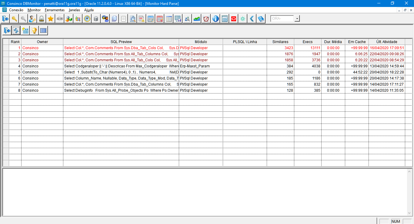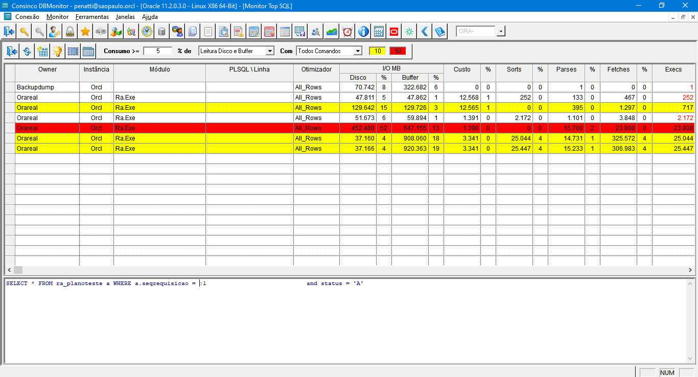 Exibe de forma rankeada, os possíveis comandos SQL candidatos a serem ofensores de consumo de recursos do banco de dados. É possível filtrar por tipo de comando SQL, além do tipo de estatística a ser analisada.