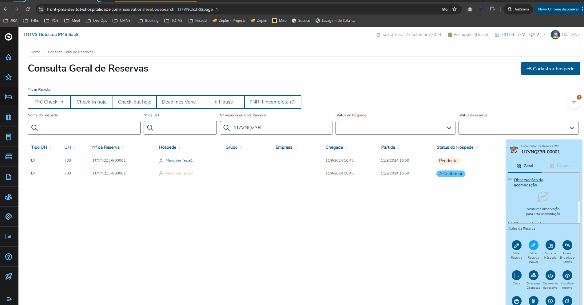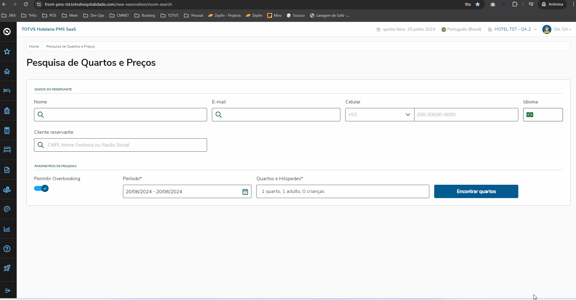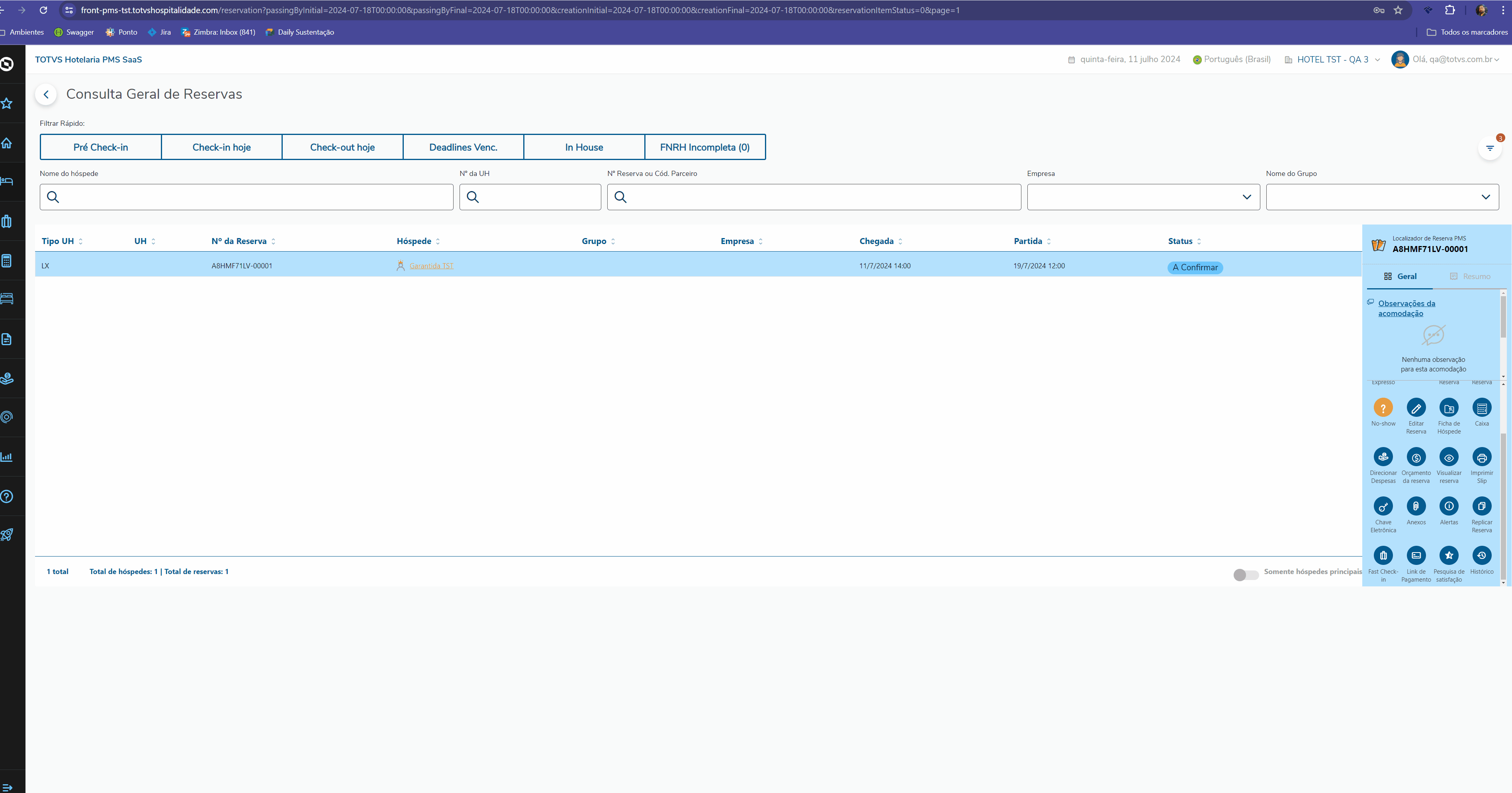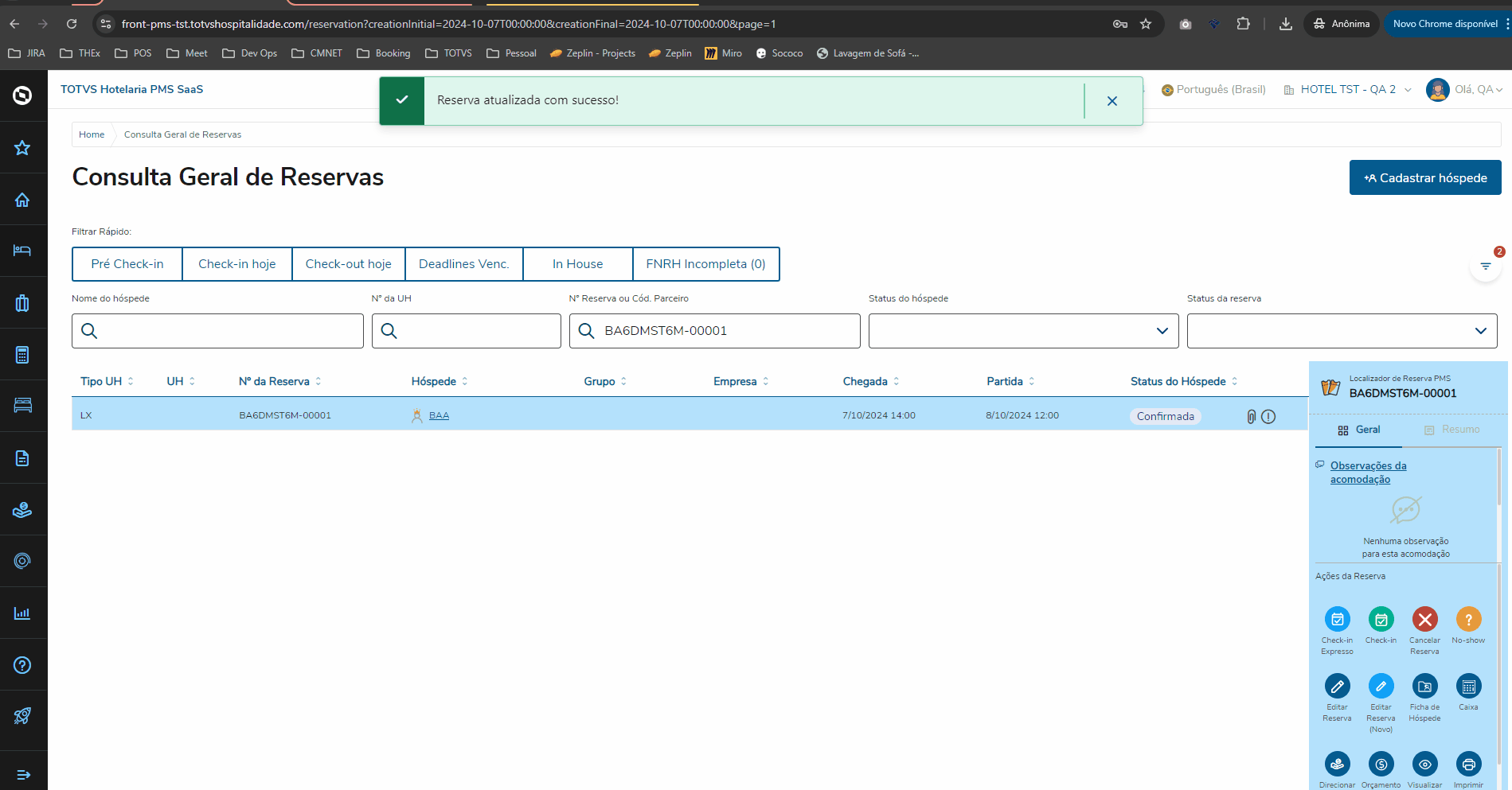 3. Quarto vago: O quarto deverá estar assignado na reserva/hóspede e status vago no momento do Check-In;