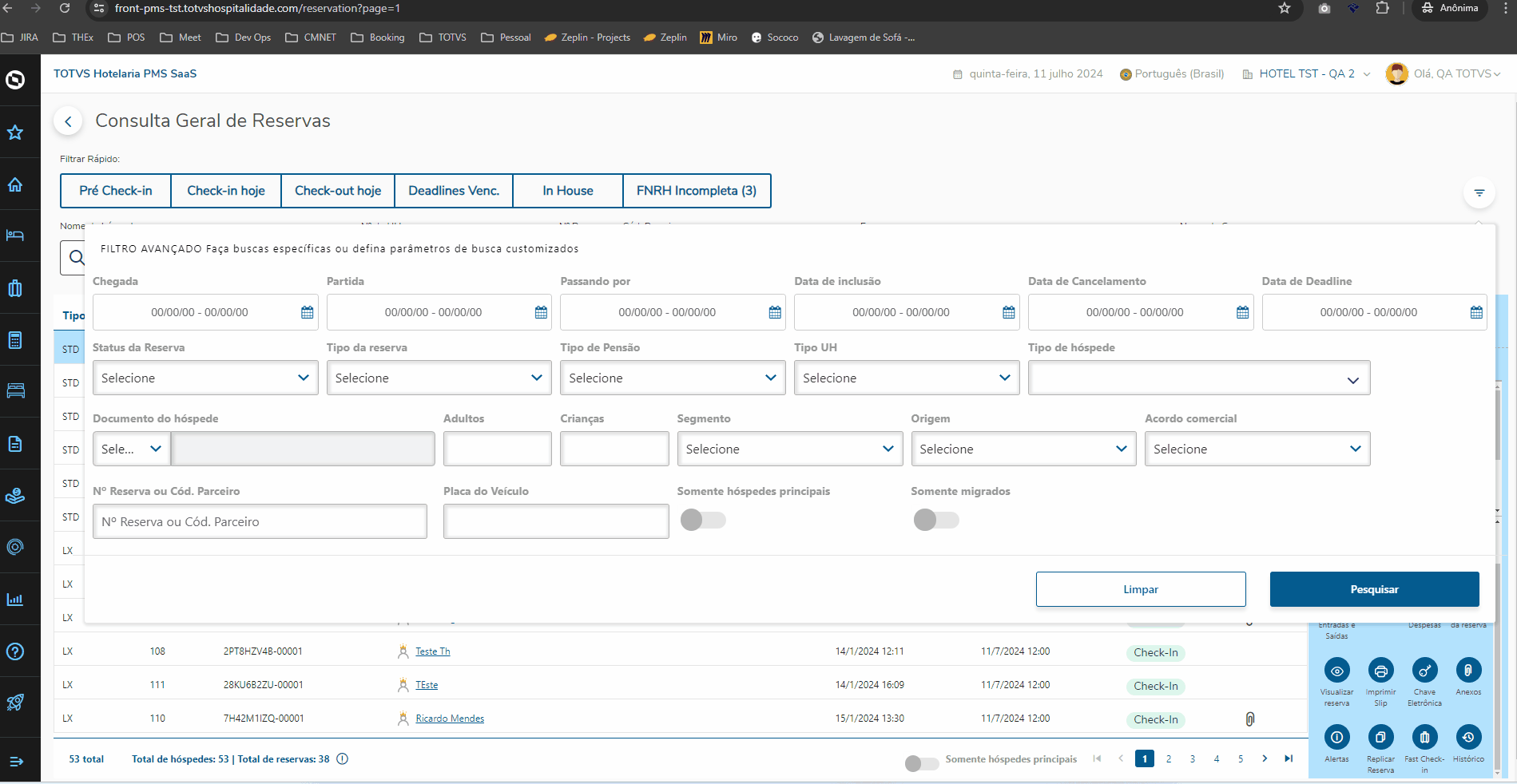 Visando proporcionar melhor experiência, o Check-In em lote conta com filtros rápidos, Hóspedes habilitados para Check-In e Hóspedes não habilitados para Check-In além do filtro avançado, onde pode buscar por empresa, grupo ou código da reserva.