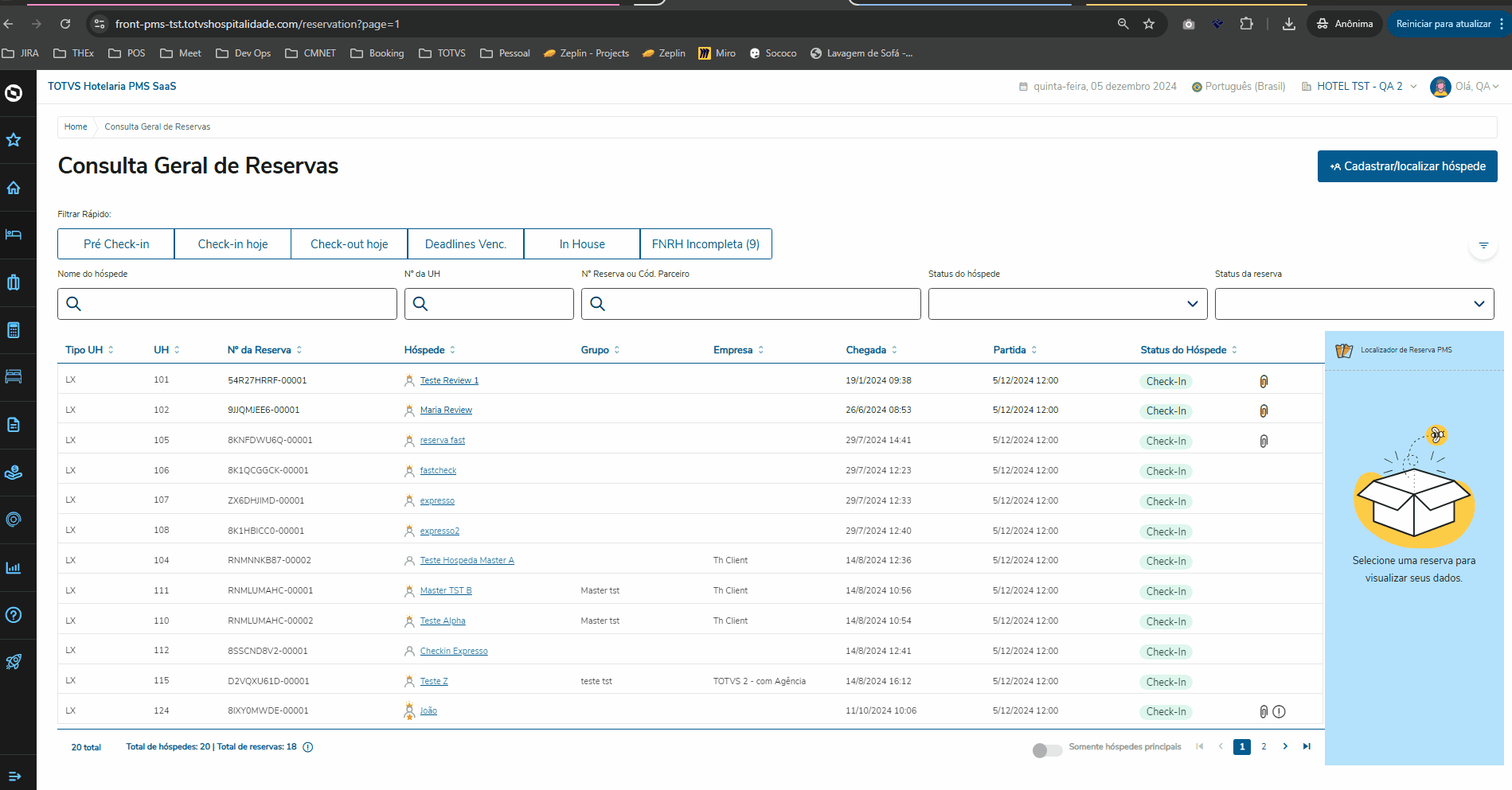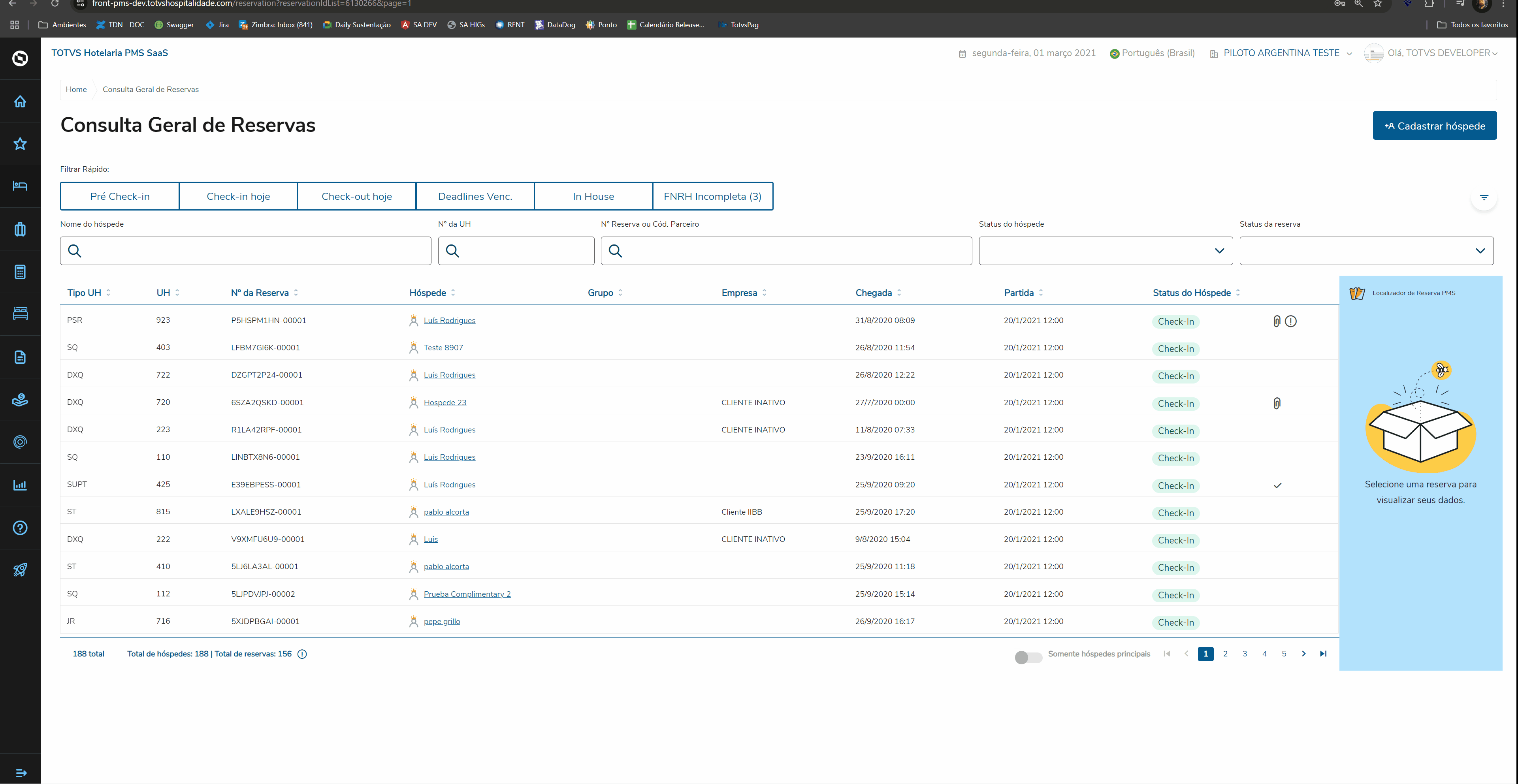 Ao acessar o Check-In em lote, o PMS SaaS lista todos os hóspedes com entrada no dia, elegíveis ou não para realizar o check-in em lote.