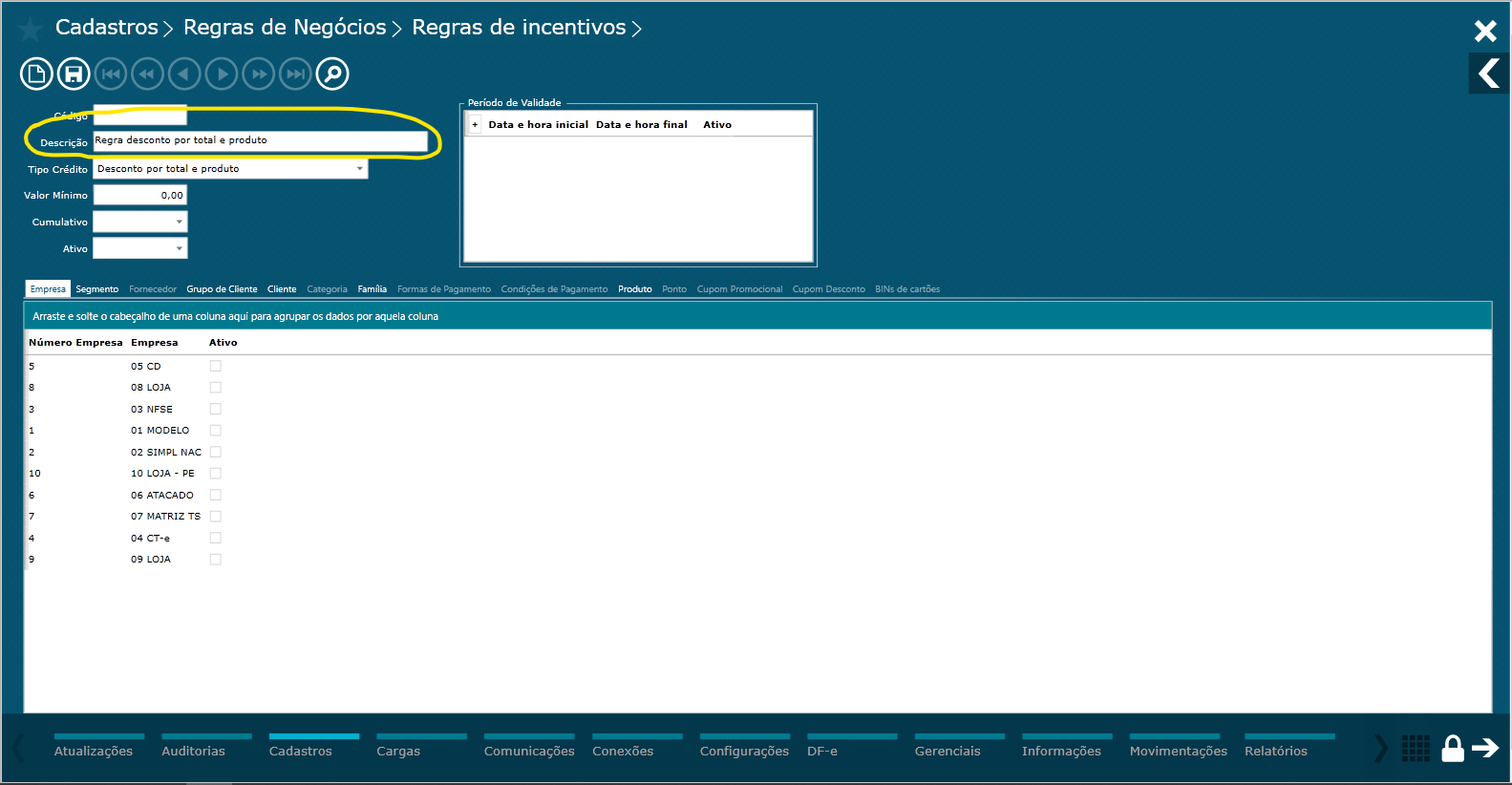 Dica: Definir um período para validade da regra de incentivo. Poderá definir vários períodos para a mesma regra;