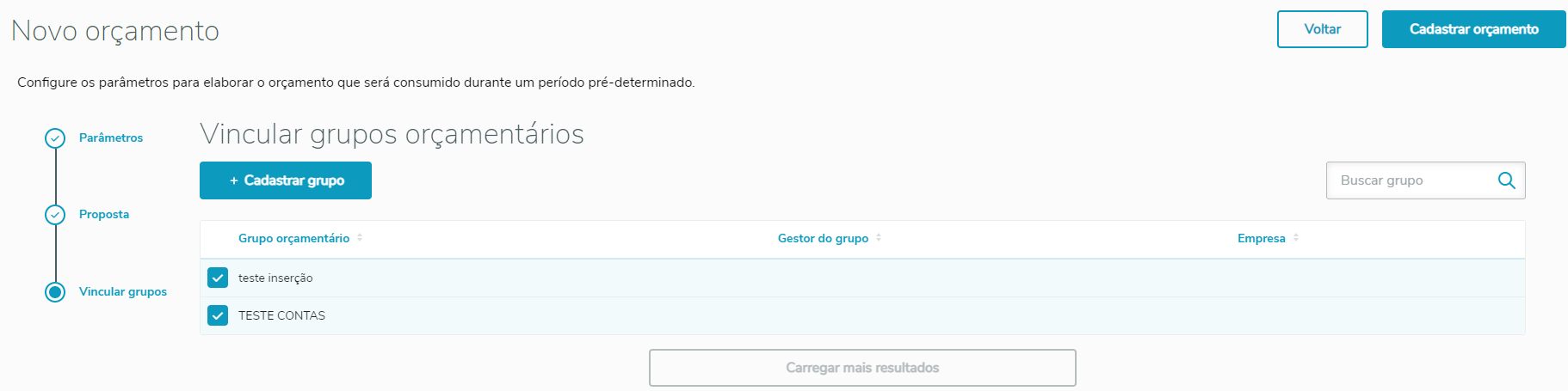 Nesta etapa, serão listados os grupos orçamentários para que seja feito o vínculo com o orçamento, podendo ser selecionados um ou vários grupos.