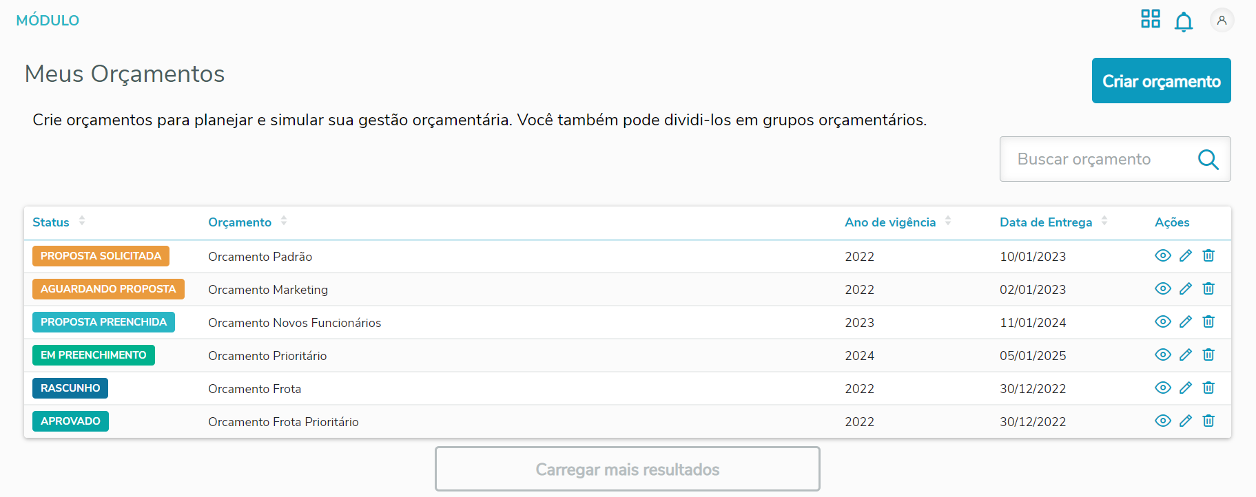 Clicando nas ações da listagem de orçamentos, é possível Visualizar, Editar e excluir Orçamentos: