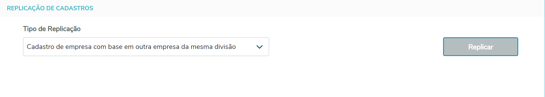 Imagem 01 - Destaque da tela de Replicação de cadastros destacando o setor de Tipo de Replicação. Filtros e Configurações O preenchimento dos campos presentes no espaço Filtros e Configurações é obrigatório. Divisão: lista de divisões cadastradas no ERP, todos os campos ficam bloqueados até que uma divisão seja selecionada. Empresa Base: lista de empresas ativas e pertencentes à divisão selecionada anteriormente. Número da empresa nova: valor numérico da nova empresa. Número da empresa PDV: valor numérico da nova empresa PDV (Campo só habilita se valor do campo 'Número da empresa nova' for maior de 3 dígitos). Pessoa da empresa nova: pessoa para a nova empresa. Nome reduzido da empresa nova: descrição de nome reduzido da nova empresa. Série de Nota Fiscal padrão da empresa nova: lista de atributos fixos do tipo Série NF. Matriz da empresa nova: lista de empresas ativas. Tipo da empresa nova: lista de tipo para a empresa nova, Central ou Loja. Segmento principal da empresa nova: lista de segmentos de venda ativos e pertencentes à divisão selecionada anteriormente. Segmentos de venda da empresa nova: Lista de segmentos de vanda ativos e vinculados a empresa base.