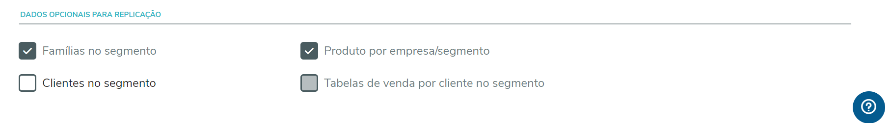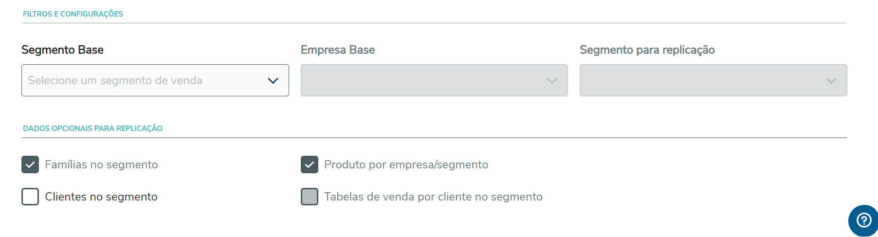 Segmento para replicação: combo que lista somente os segmentos de venda ativos, exceto o selecionado como Segmento base