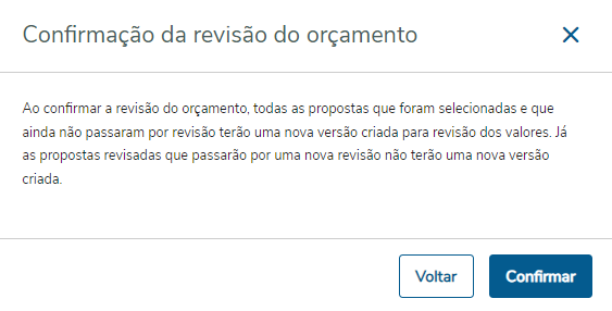 Revisar orçamento: Encaminha para a página de Revisões do orçamento, permitindo iniciar uma nova revisão, editar, preencher novos valores das propostas e consultar as revisões em andamento.