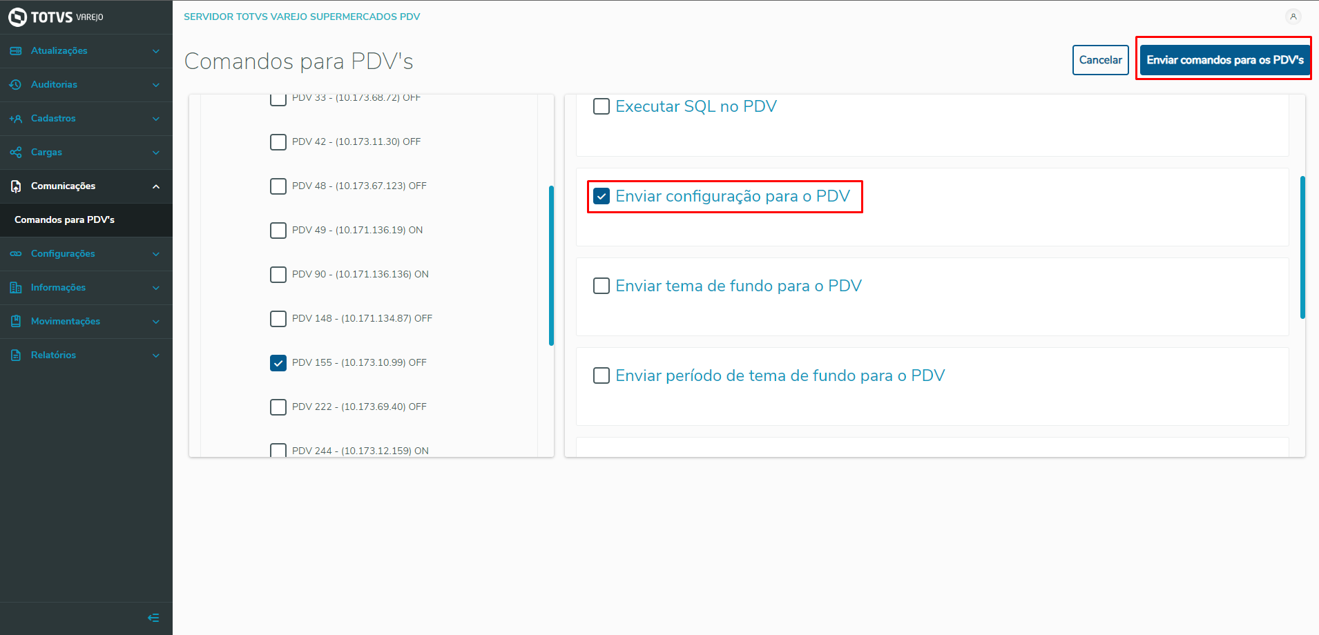Selecione os PDV's desejados, os comandos Enviar configuração para o PDV e clique no botão Enviar comandos para os PDV's.