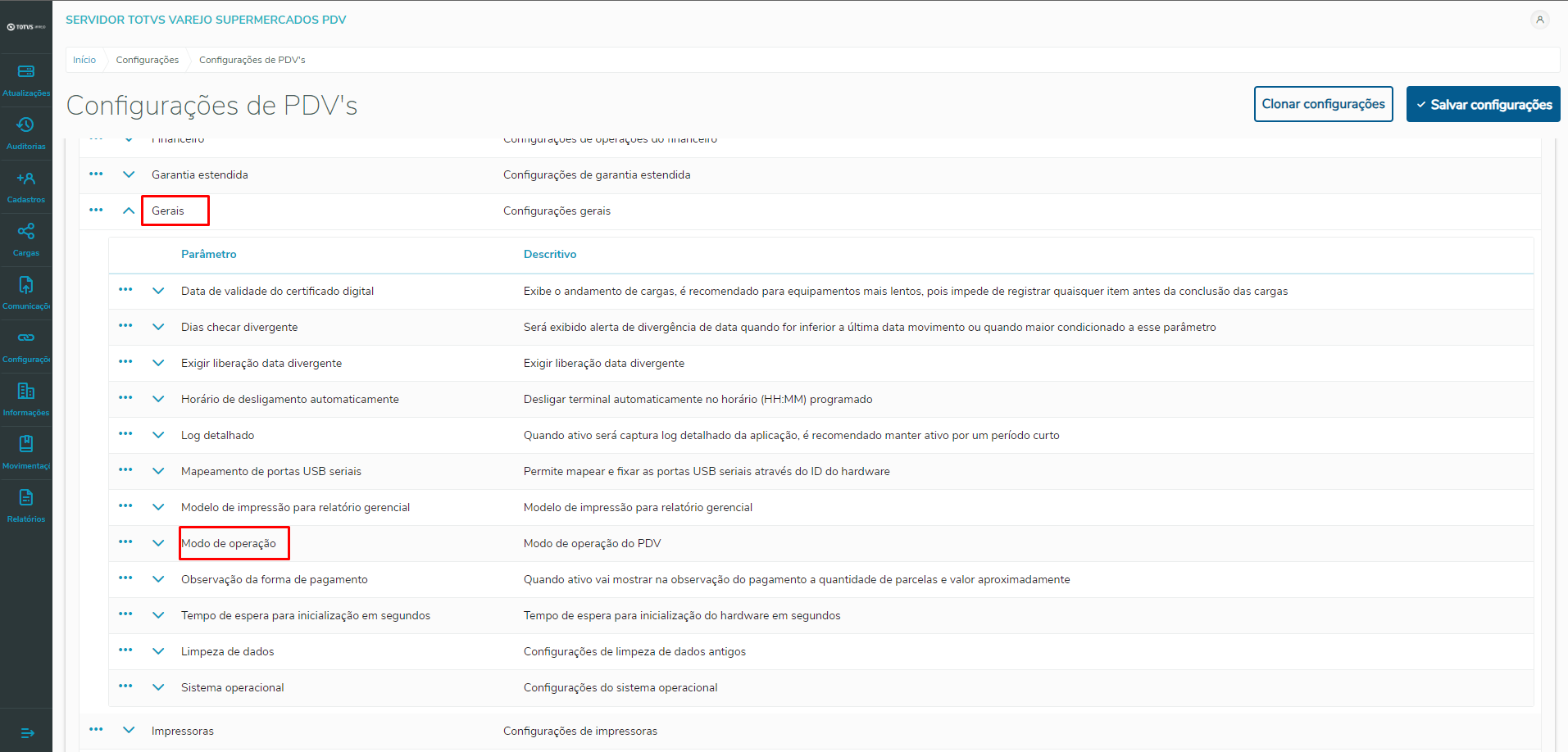 Monitor PDV/ Configurações / Configurações de PDVs / Gerais / Modo de operação.
