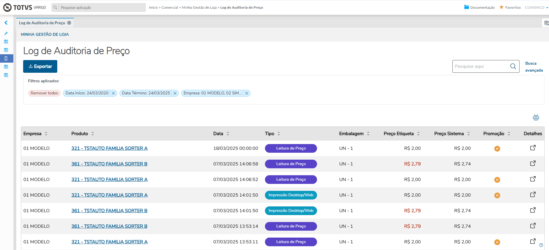 Módulo Comercial WEB > Comercial > Minha Gestão de Loja > Log de Auditoria de Preço