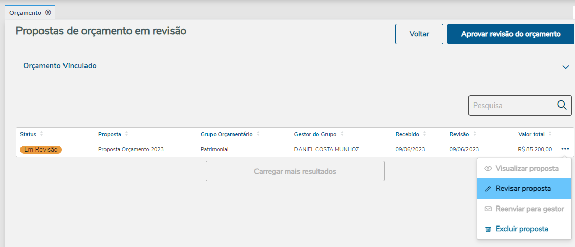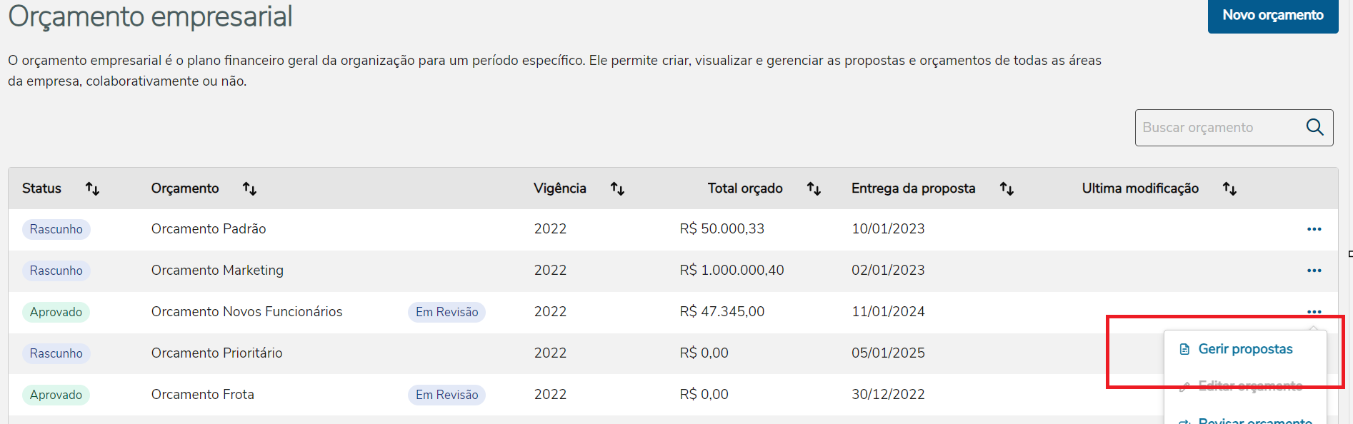 Na tela de orçamento empresarial, é possível visualizar uma lista de todos os orçamentos cadastrados e ativos. Para criar um novo orçamento, clique em Novo orçamento.
