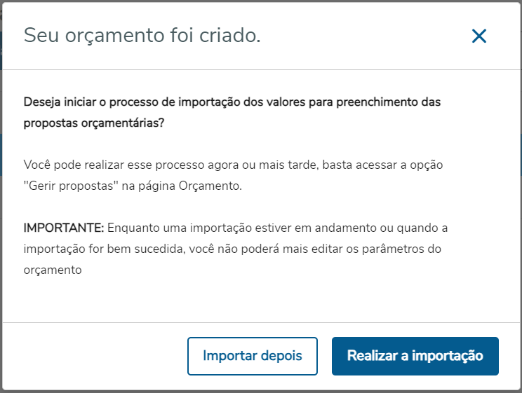Para a criação de um novo Orçamento, é necessário que exista pelo menos um Grupo Orçamentário cadastrado. Caso contrário, será exibida uma mensagem redirencionando para o Cadastro de Grupos. |
