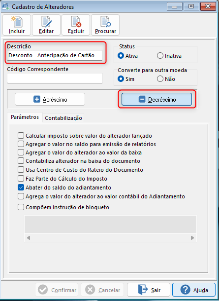 Informe a Descrição, o Status Ativo,  selecione o tipo Decréscimo e marque o flag " Abater do saldo do adiantamento", conforme imagem abaixo: