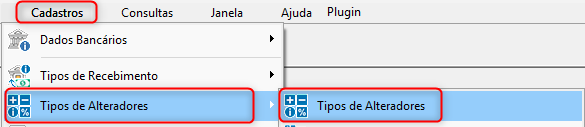 Acesse: Contas a Receber - Cadastros - Tipos de Alteradores - Tipos de Alteradores