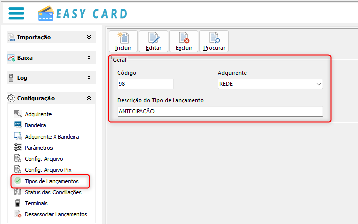 Realize o cadastro do Tipo de Lançamento referente a movimentação de Antecipação de Cartões, conforme Layout da Adquirente.