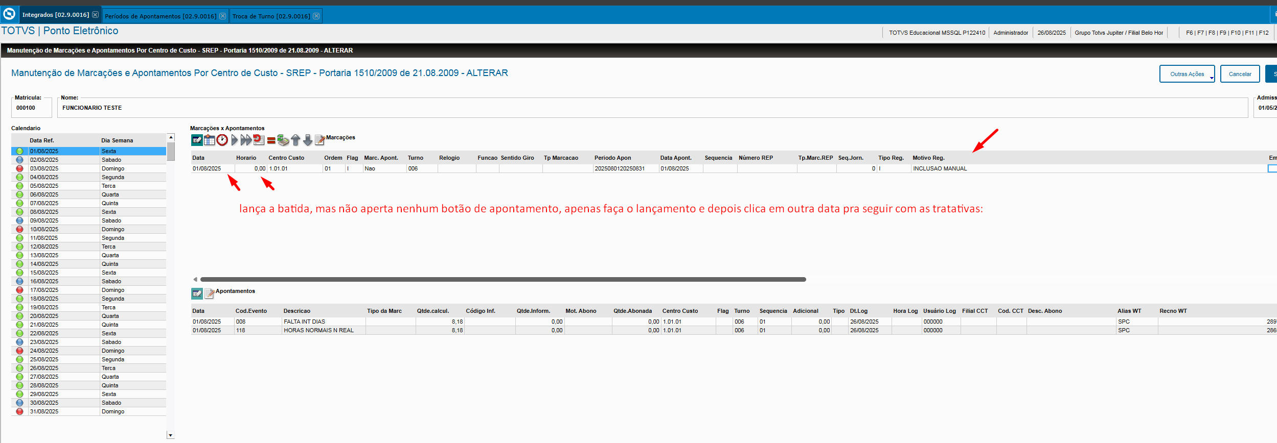 →Ao clicar em outra data, ao retornar no dia 01/08 a batida lançada some: